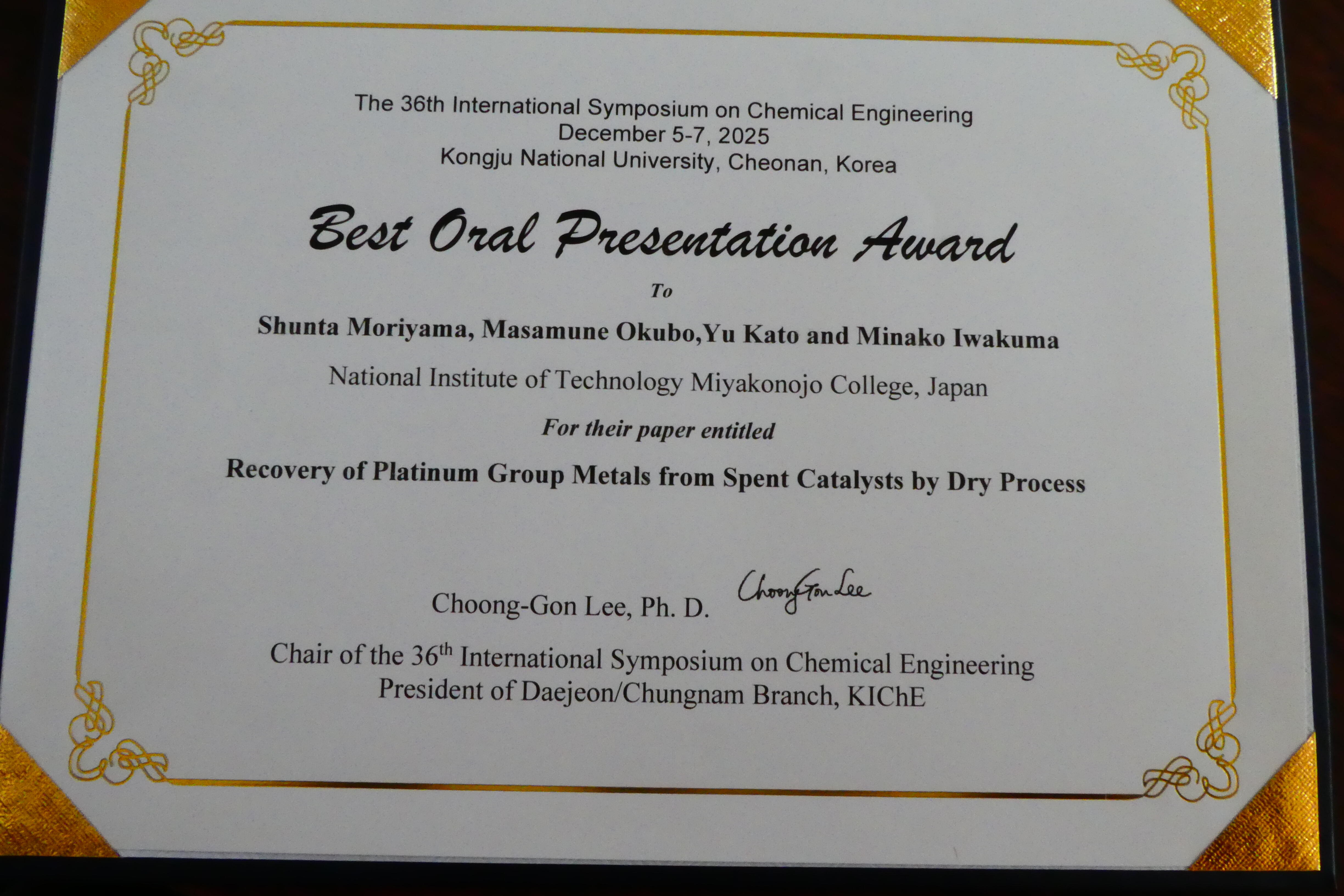 12月5日(金)~7日(日)に韓国の公州大学天安キャンパス(Kongju National University, Cheonan, Korea)で開催された『The 36th International Symposium on Chemical Engineering(ISChE 2025)』に、本校物質工学専攻1年生の救仁郷 明香里さん、森山隼太さんの2名が参加し、研究を口頭発表いたしました。