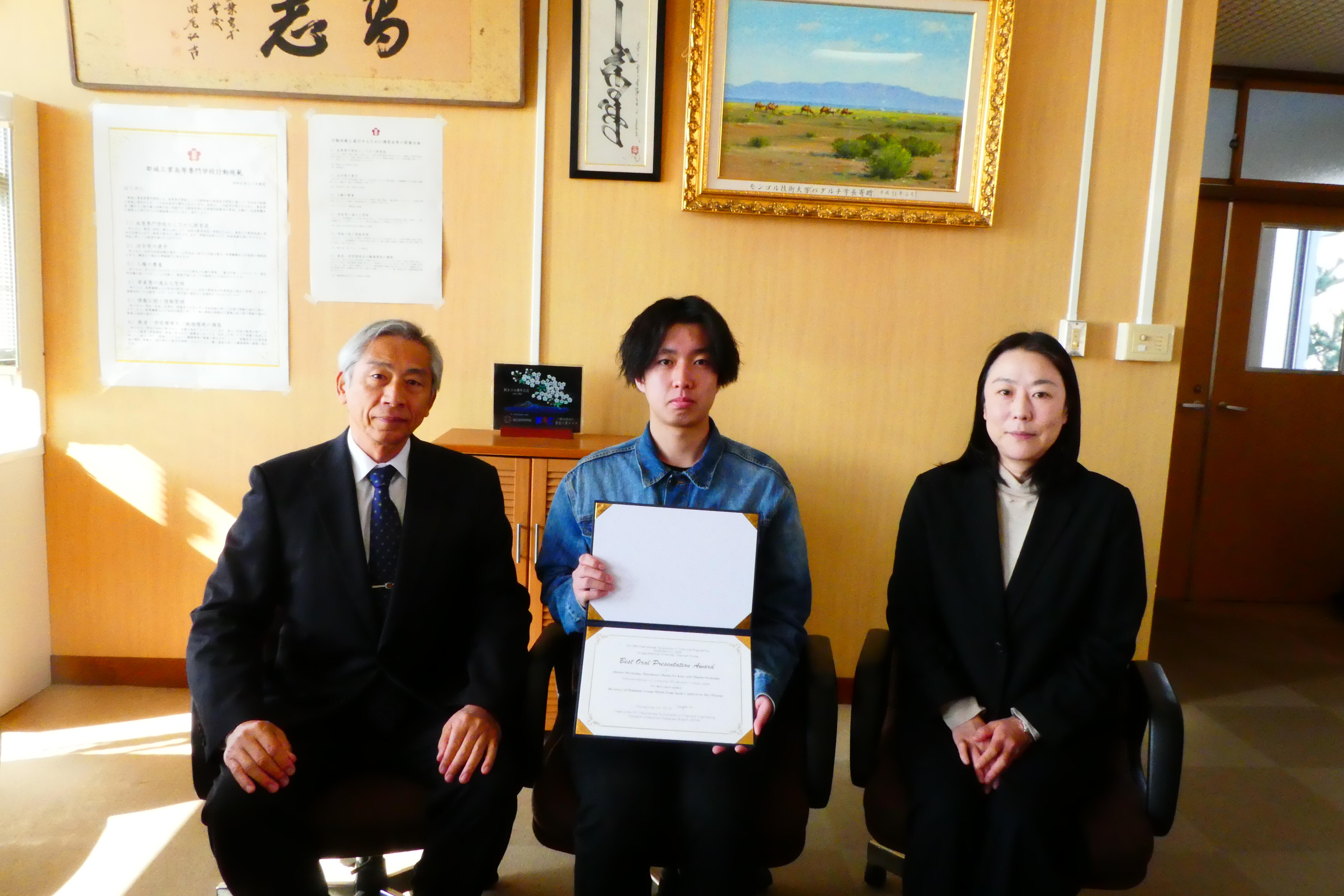 本学会で、森山隼太さんが『Best Oral Presentation Award』を受賞いたしました。ほとんどの参加者が大学院生(128名)という中で、口頭発表と質疑をすべて英語で行い、健闘しました。高専生(専攻科生)の受賞は初めてとのことです。