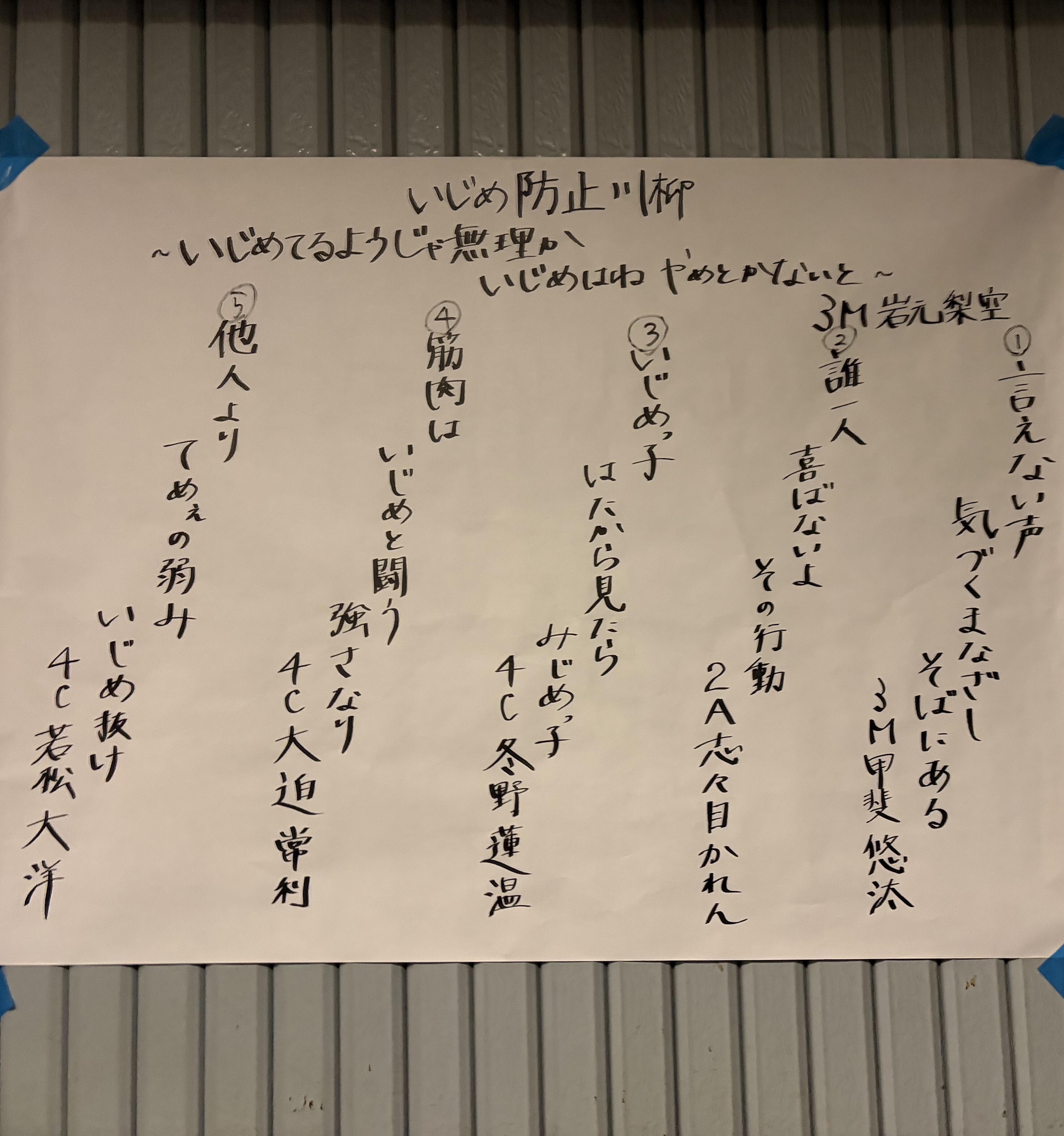 また、12月15日(月)から12月19日(金)は、本校の令和7年度いじめ防止週間でした。今年度のいじめ防止週間では、いじめ防止を意識づけるイベントとして5.7.5で作った川柳を募集し、「いじめ防止川柳大会」を実施しました。クリスマス会の参加者に投票してもらい、応募された6名の川柳から最優秀賞を決定しました。