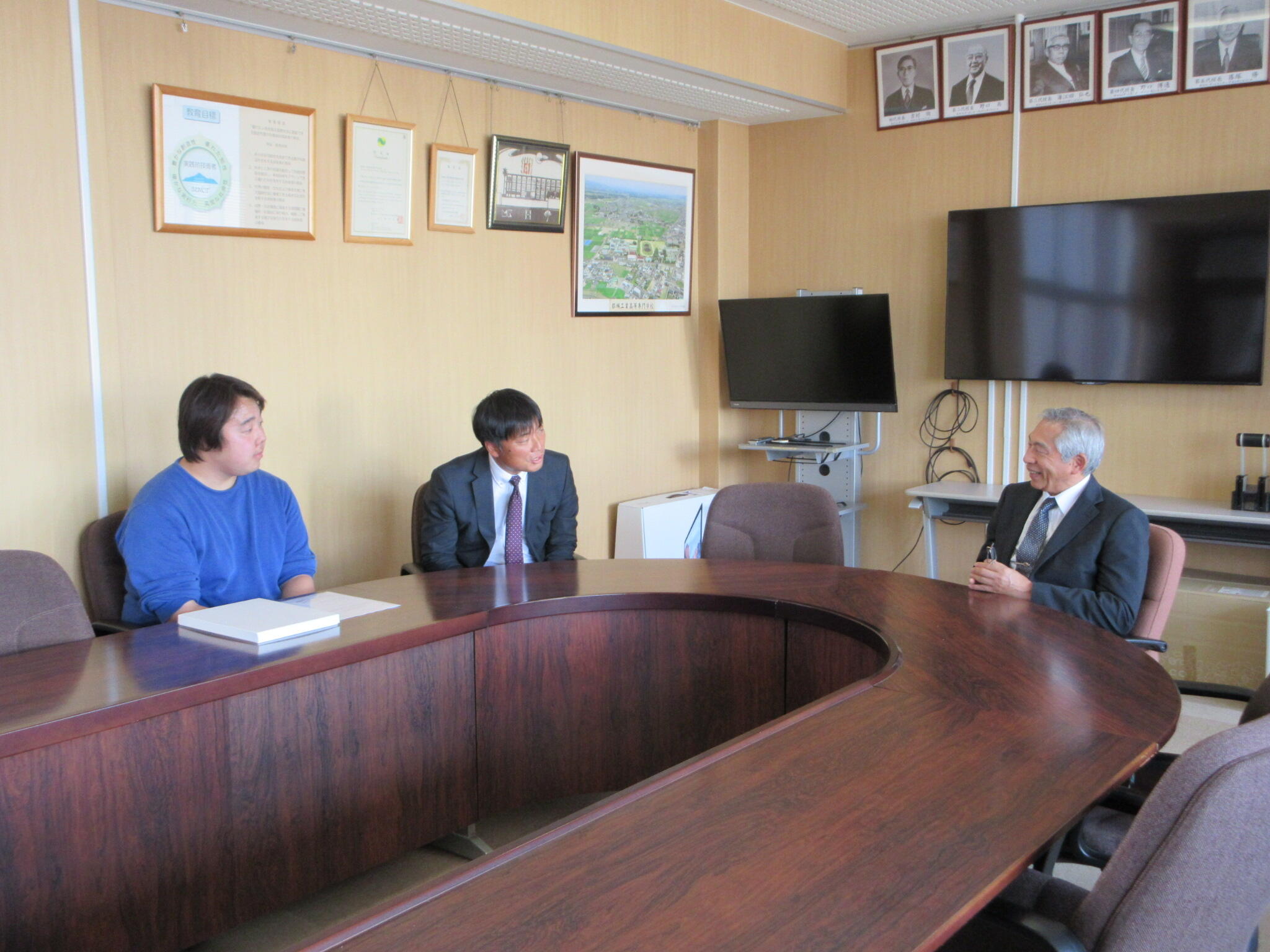 校長から研究内容について質問され、緊張した様子で研究内容の詳細を説明しました。校長からは、専攻科修了後も、これまで培ってきた研究内容を就職先で活かしながら頑張るよう励ましの言葉をいただきました。