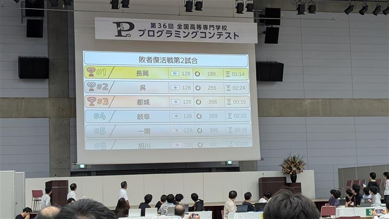 10/11(土)・12(日)に島根県松江市のくにびきメッセで開催されました第36回全国高等専門学校プログラミングコンテストの本選大会に、本校から自由部門・競技部門の2チームが出場しました。1日目(10/11)の自由部門ではプレゼン審査、競技部門では1回戦が行われました。プレゼン審査では、本校チームが開発した「学生向けストレス管理アプリ」に関し、3E東園君が審査員の前で開発の経緯や、アプリの特徴について説明しました。競技部門では、フィールドに散りばめられた数字を最短手順でペアにする競技が行われ、本校チームも健闘しましたが、わずか5手差で2回戦進出を逃し、翌日の敗者復活戦に臨むこととなりました。2日(10/12)の自由部門ではデモンストレーション審査、競技部門では敗者復活戦が行われました。デモ審査では、開発したアプリを審査員の前で実際に動かしながらの説明を4E友清君を中心に行いましたが、システムの安定性が悪く、審査員の前でパフォーマンスを十分に発揮できない場面がありました。競技部門の敗者復活戦では、アルゴリズムの改良により、リーグ3位に食い込みましたが(2位までが準決勝進出)、残念ながら手数が2位と11手差で惜しくも準決勝進出を逃しました。最終的な結果としては、自由部門・競技部門共に三賞(最優秀賞・優秀賞・特別賞)および企業賞を獲得することはできませんでした。しかしながら、競技部門に関しては昨年度より本校チーム内の技術レベルが大幅に向上し大健闘した大会だったと思います。自由部門に関しては、情報処理部として本選進出したのが都城大会以来6年ぶりだったこともあってノウハウの継承が難しく、そのため開発に遅れが生じ安定性が低くなり、開発したアプリを万全の状態で審査員の前でアピールできなかったのが悔やまれるところです。ただ、他のチームの発表や展示を見ることで、プレゼンやデモのやり方や、役割分担、スケジュール管理に関して学ぶべきところも多かったと思います。なお、各チームの学生は以下の通りとなっております:【競技部門】4E 松岡・川畑・増森、【自由部門】3E 東園・小林/4E 友清・鎌田・加治屋。