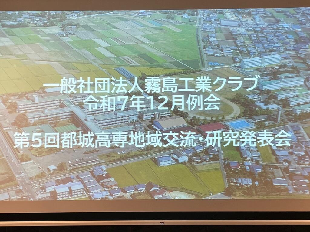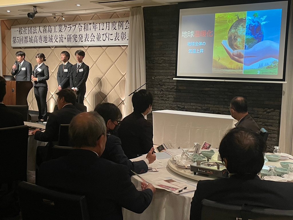 令和7年12月11日(木)、都城グリーホテルにて第5回都城高専地域交流・研究発表会(都城高専と(一社)霧島工業クラブの共催)(写真1)が行われました。これは専門学科4クラス(高専4年生)による研究発表を霧島工業クラブの会員企業様に向けて行うというものです。機械工学科4年生からは『教育用スターリングエンジンの製作と性能評価』と題したテーマ(製作リーダー:谷本暁斗さん、福留陸翔さん)でスターリングエンジンの製作を行った内容を発表しました(発表者:橋口翔護さん、宮本彩名さん、写真2)。発表後に審査が行われ、霧島工業クラブ奨励賞と都城高専同窓会から深山会特別賞を受賞しました(写真3)。おめでとうございます!!