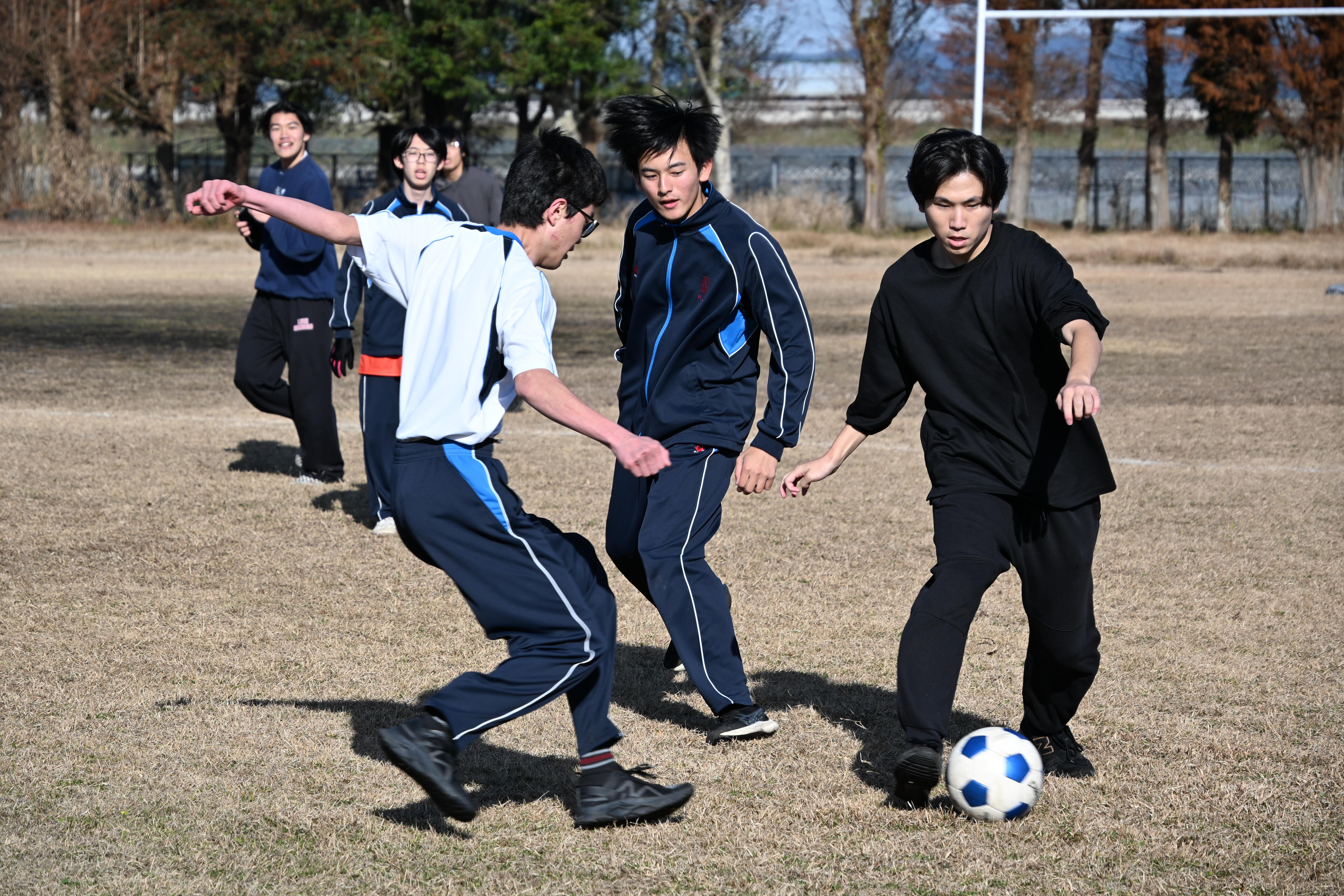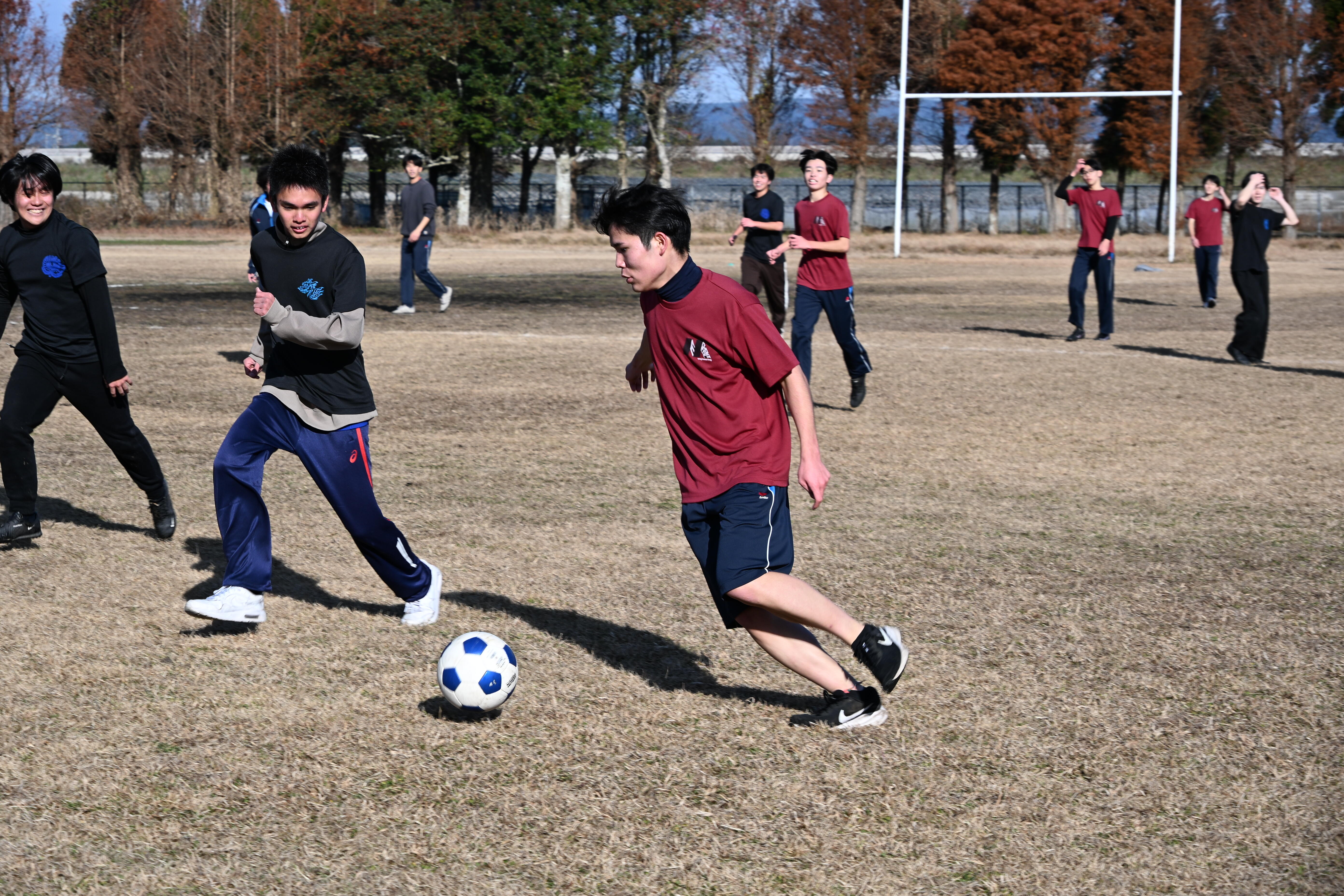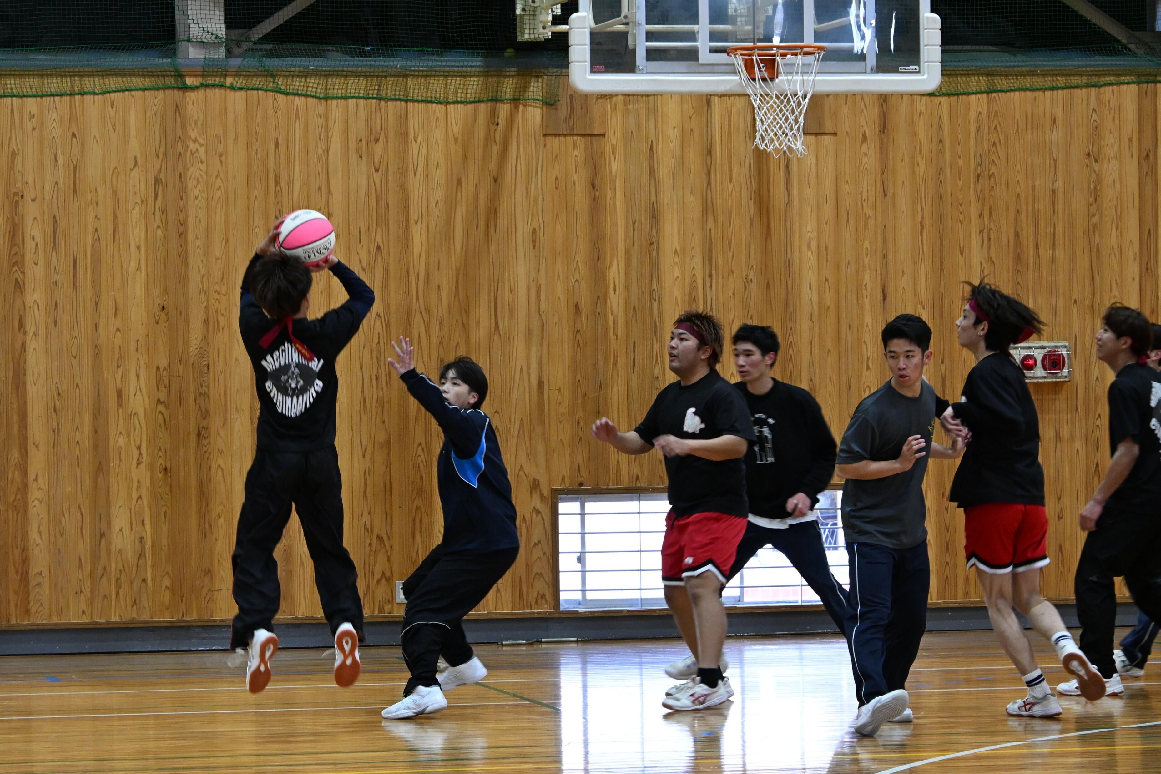 令和7年12月23日(火)にクラスマッチが開催され、バスケットボール、バレーボール、サッカー、ドッジボール(女子のみ)の4種目で白熱した試合が繰り広げられました。サッカーでは、機械工学科1年生が高学年に勇敢に挑む姿(写真1)や、機械工学科2年生が華麗なドリブル突破を見せる場面(写真2)がありました。バレーボールでは、機械工学科3年生が相手の攻撃を力強くブロックする様子(写真3)や、機械工学科5年生がレシーブで粘り強く返すプレーが光りました(写真4)。バスケットボールでは、機械工学科4年生が果敢にシュートを放ち、相手を圧倒する活躍を見せました(写真5)。