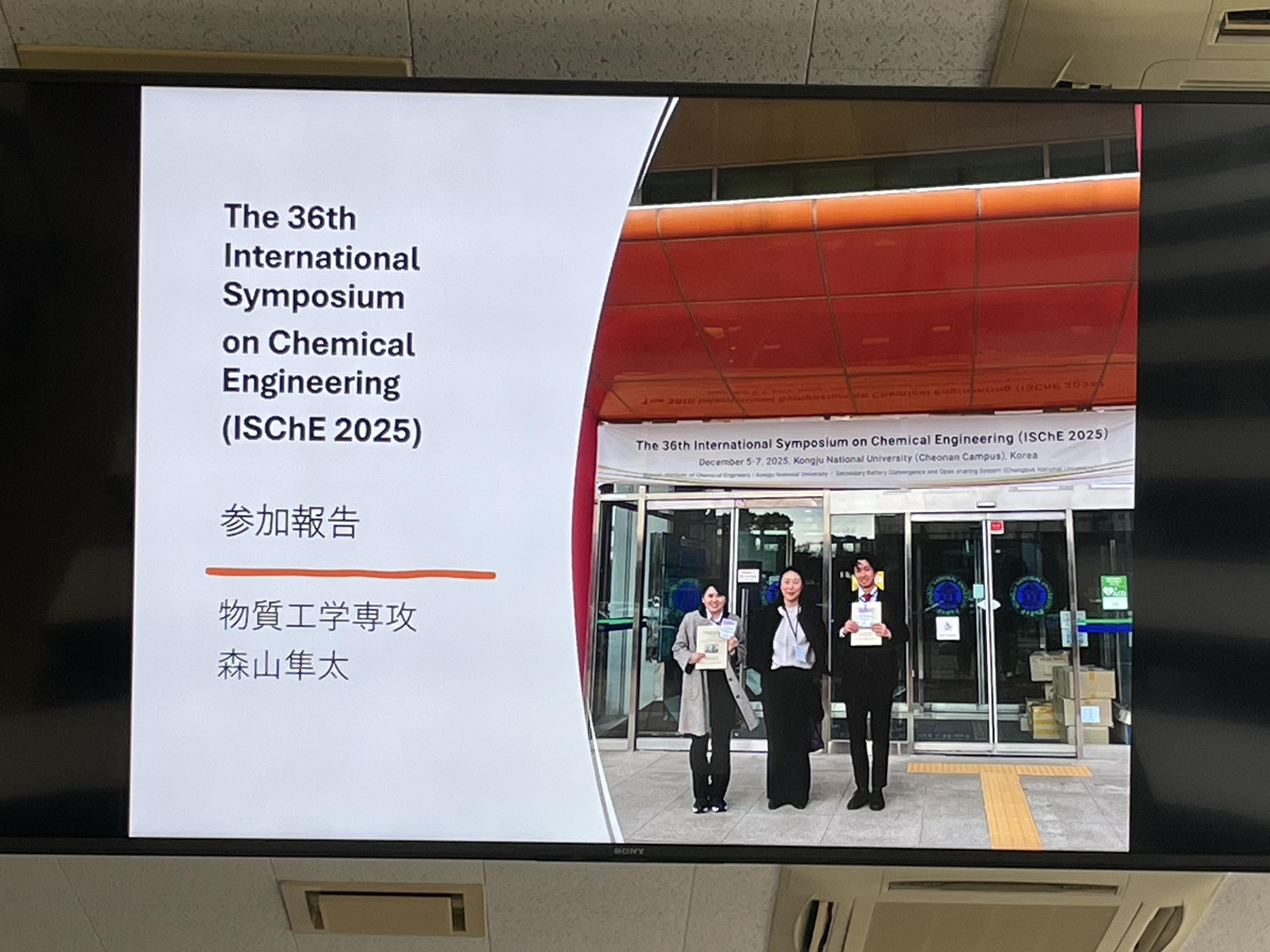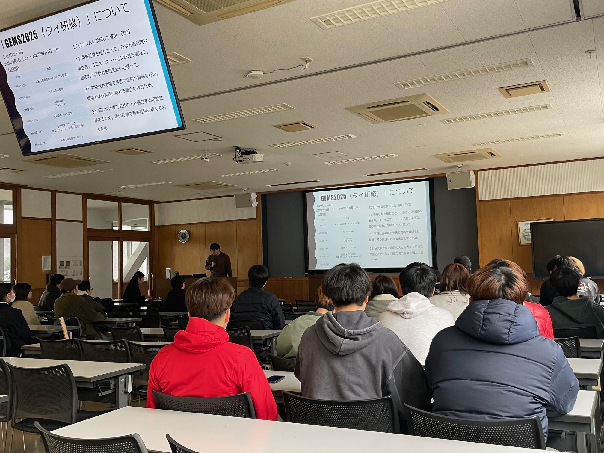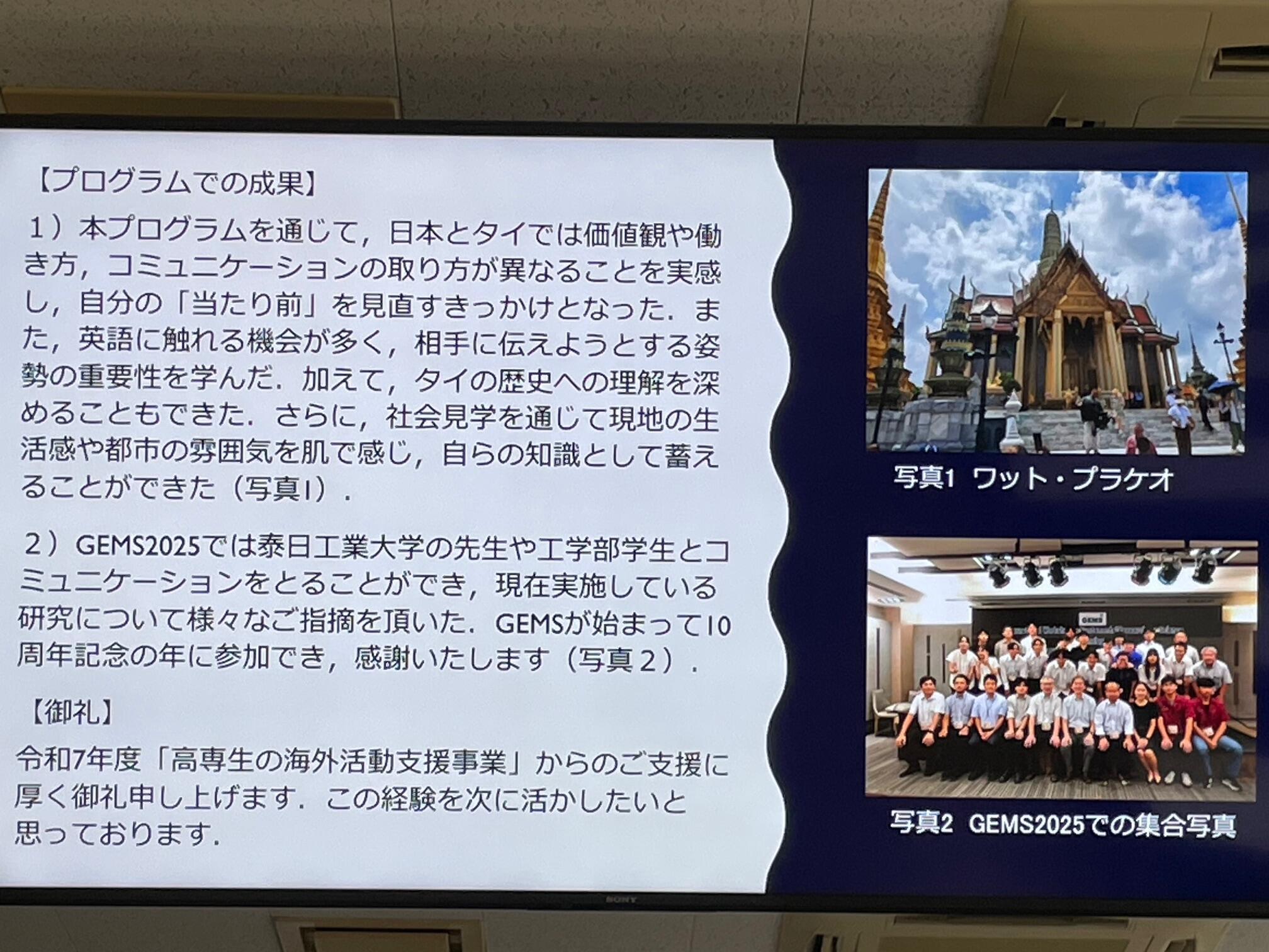 令和8年2月10日、令和7年度海外活動支援事業に参加した学生の海外活動報告会が開催(写真1)され、タイ王国で行われた英語での学術研究発表会(GEMS2025)および日系企業工場見学の報告が行われました(写真2)。このGEMS2025は10年目を迎え、Thai-Nichi Institute of Technology(泰日工業大学工学部)との包括協定の枠組みの中で実施され、コロナ禍であっても開催を継続しました。今回は機械工学科と電気情報工学科から26名が参加しました。その他、モンゴルでの学生交流や韓国でのISChE 2025での講演発表(写真3)などの報告がありました。ISChE 2025で講演した専攻科学生(物質工学専攻)は見事Best Oral Presentation(最優秀講演者)を受賞しました。おめでとうございます。